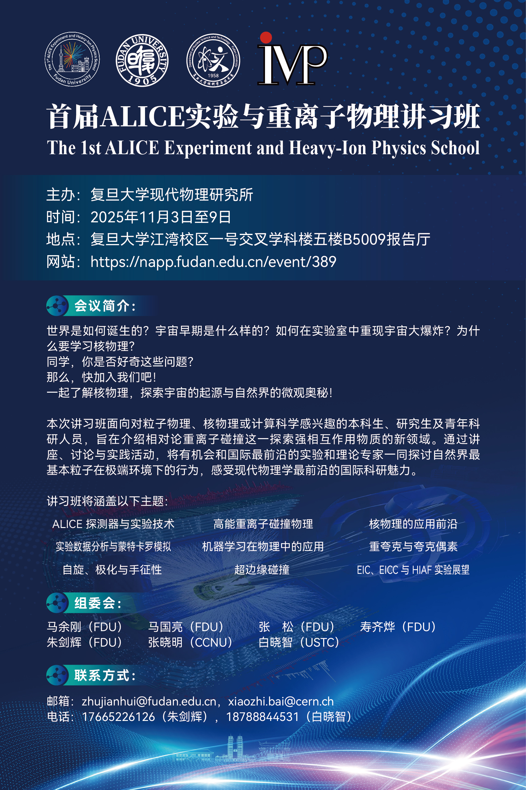 The 1st ALICE Experiment and Heavy-Ion Physics Workshop will be hosted by Fudan University in Shanghai, China. The workshop will take place from November 3rd to 9th 2025 at No.1 Interdisciplinary Research Building Jiangwan Campus, Fudan University (复旦大学江湾校区一号交叉学科楼). Please note that November 2nd is reserved for registration and welcome reception.